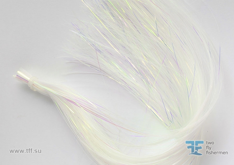 Оригинальный Flashabou шириной 1/69” материал зафиксирован в верхней части и сложен пополам, для изготовления больших моделей мух. Длина 53 см. Примерно 1700 нитей в упаковке